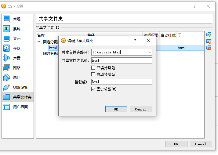 共享文件夹配置的核心坑点:不要勾选"自动挂载" ,手动挂载 +