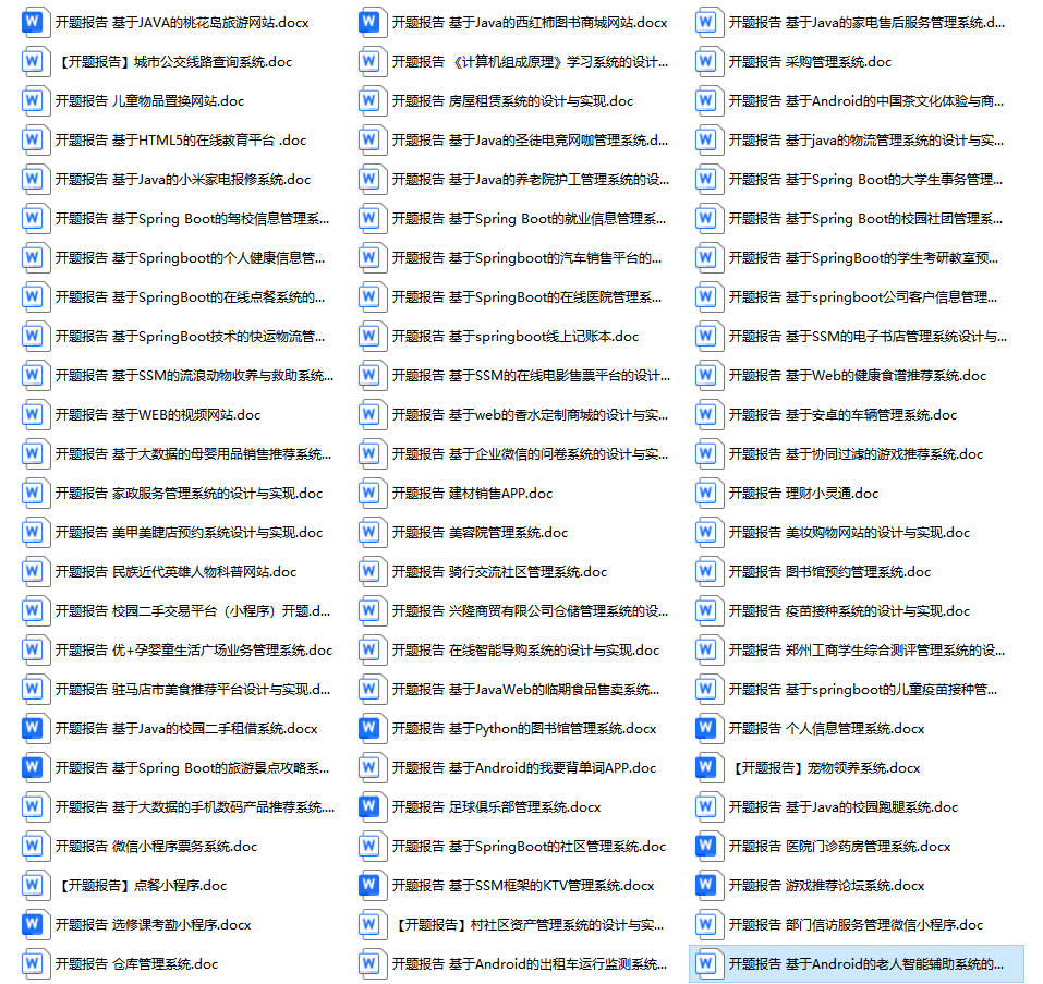 以上是某同学的毕业设计答辩的过程,如果你现在还没有参加答辩,还是开题阶段,已经选好了题目不知道怎么写开题报告,可以下面找找有没有自己符合自己题目的开题报告内容,列表中的开题报告都是往届真实的开题报告,可发送使用或参考。文末或底部来联xi可免费获取