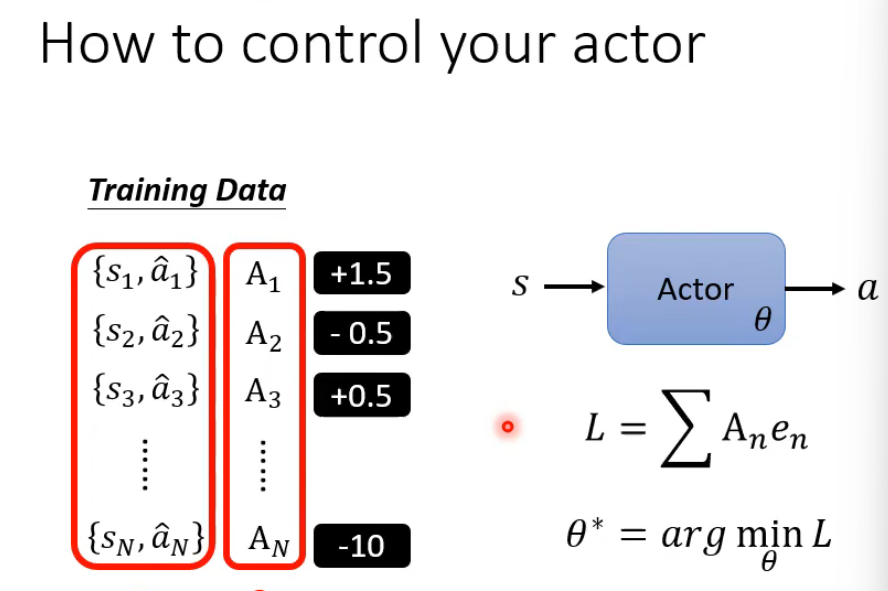 其核心思想是利用一系列状态-动作对 {st,at}{st,a^} 及其对应的优势值 AtAt(正数表示动作优于平均水平,负数则相反)来引导策略更新。通过构建损失函数 L,其中 en 通常为动作的负对数概率,将优势值作为权重,使得智能体在优化参数 θ 以最小化 L 的过程中,更多地学习优势高的动作,抑制优势低的动作。最终,训练好的策略网络能够根据输入状态 s输出更优的动作 a,从而提高累积奖励。这种方法结合了监督学习(给定目标动作)和强化学习(优势加权)的特点,以实现更稳定高效的学习。