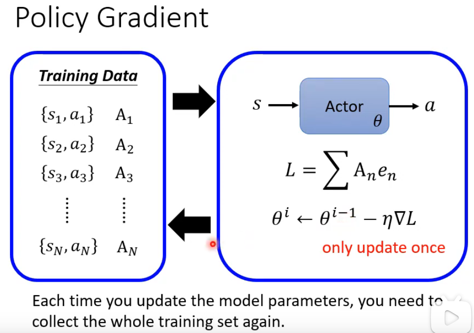 策略梯度(Policy Gradient)算法的核心训练流程及其关键限制。它首先通过当前策略网络(Actor)与环境交互收集一批状态-动作对数据,并为每个动作计算优势值 AnAn 以衡量其相对优劣。随后使用这些数据构建损失函数 L,并通过梯度下降对策略参数 θθ进行一次更新,每次参数更新后,必须丢弃当前数据并重新收集完整的训练集
