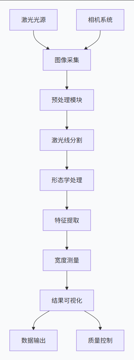 本文针对红色激光线投影下的缝隙宽度测量这一具体应用场景,设计并实现了一套完整的视觉检测系统。系统采用630nm红色激光器作为结构光源,通过数字图像处理技术对激光线图像进行分析,实现亚像素级缝隙宽度测量。