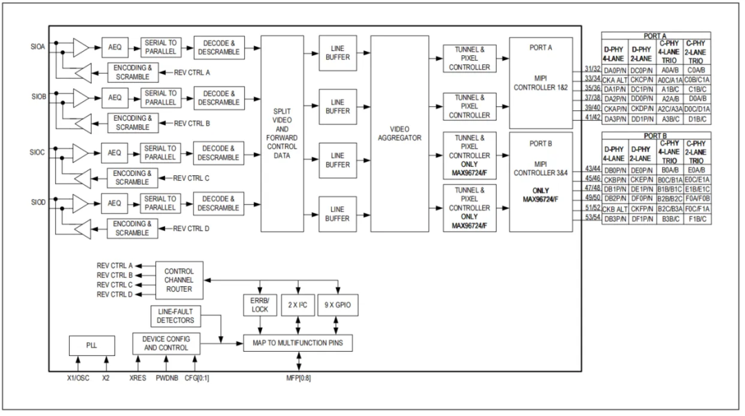 多路 LINE BUFFER 的输出进入VIDEO AGGREGATOR,将4路GMSL输入的视频流(或部分通道)聚合成 1~2 路符合 MIPI CSI-2 带宽的数据流(MAX96724 支持 2 路 MIPI 输出端口:PORTA、PORTB)并处理多摄像头的画面拼接、时序同步,生成统一的视频帧格式输出到隧道与像素控制器模块(TUNNEL & PIXEL CONTROLLER)。
