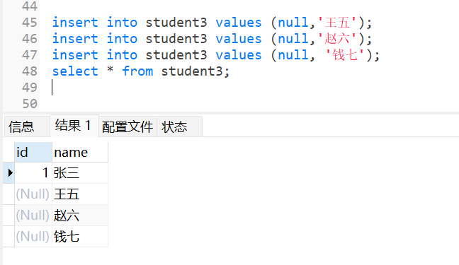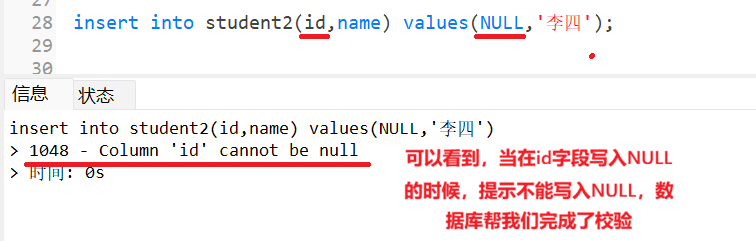当在id字段写入NULL的时候就会报错