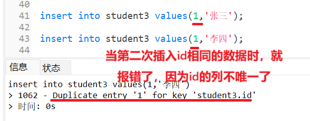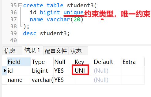 如果想要避免这种情况,我们可以对id字段使用unique约束
