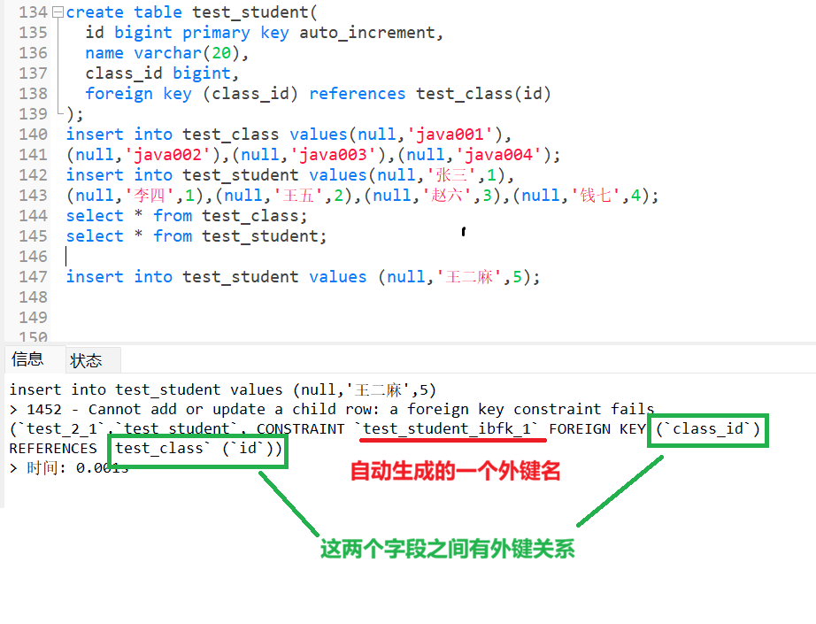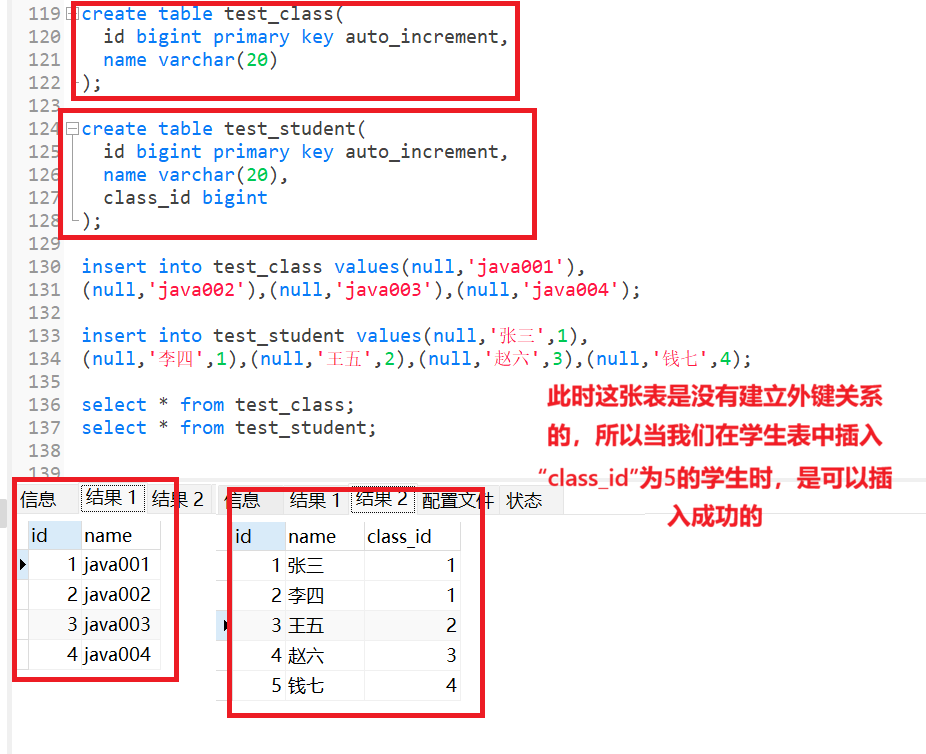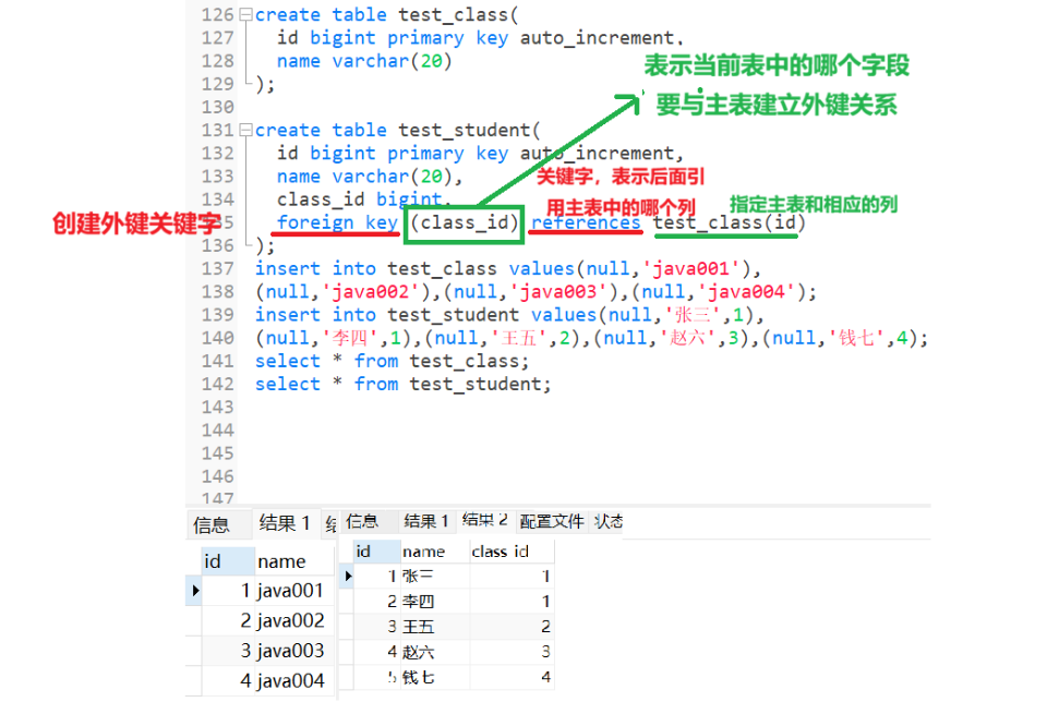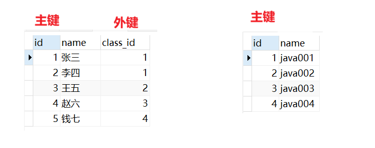 此时,我想要这两张表建立联系,即学生表的 "class_id"正好对应的时班级表中的 "id"值,那么我们就需要是一个外键来建立联系
