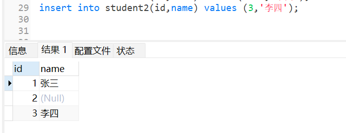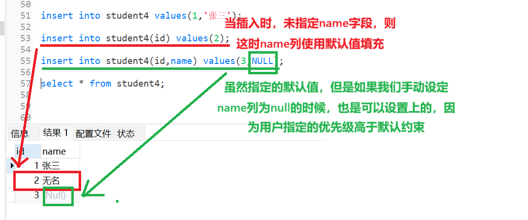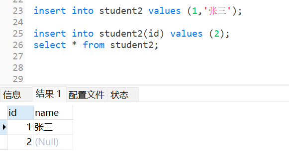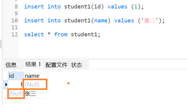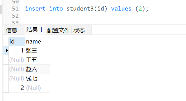 此时,当我插入数据的时候,只给id字段提供值时,那么name字段就默认为null