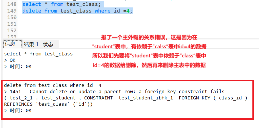 当我要删除 "class"表中的数据时,我们发现报错