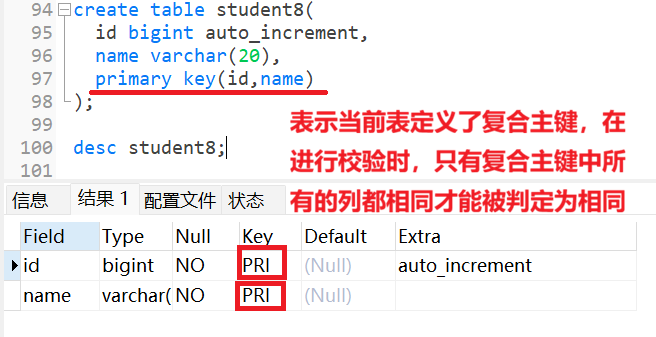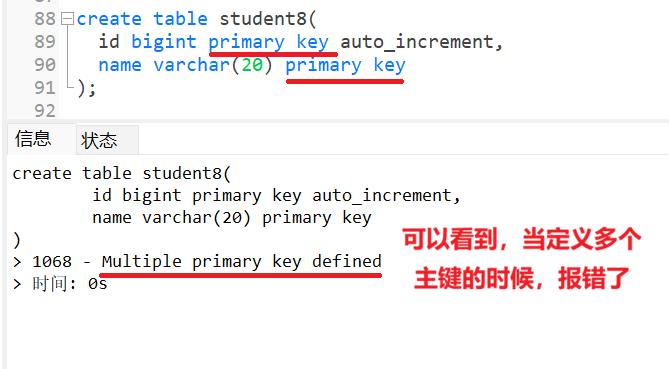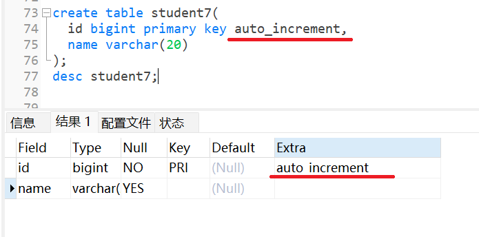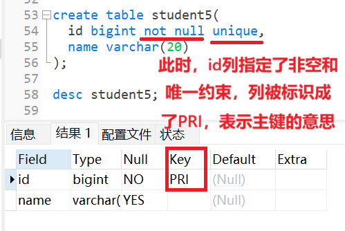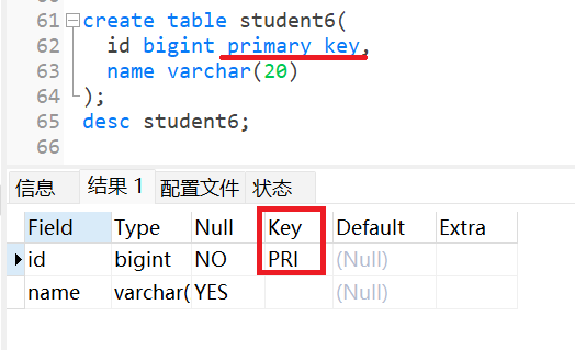 同样我们可以直接在定义表的时候,就将id字段设置为主键