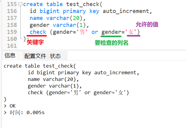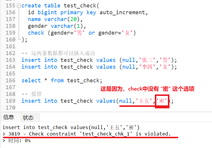 保证列中的值符合指定的条件,对于MYSQL数据库,对CHECK子句进行分析,但是忽略CHECK子句。CHECK在5.7版本中不能使用,在8.0版本中可以使用,所以只需要稍微一演示即可。