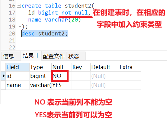 上面是我创建的一个学生表1,同时id和name字段都没有使用NOT NULL 进行约束