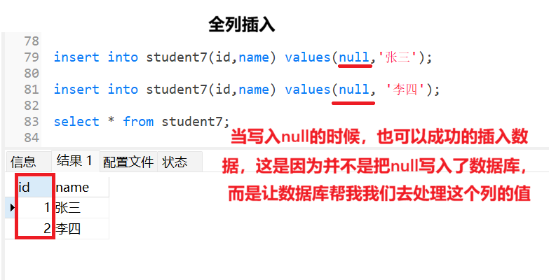 也就是说,在id和name字段中是可以插入NULL值的