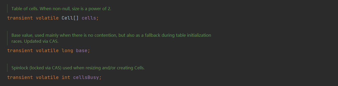 - 类型: transient volatile int cellsBusy,基于 CAS 操作实现的无锁轻量级自旋锁。