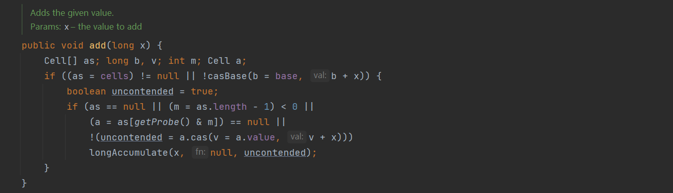 前置判断:获取当前 cells 数组赋值给 as,同时尝试通过 casBase() 方法 CAS 更新 base(累加 x)。