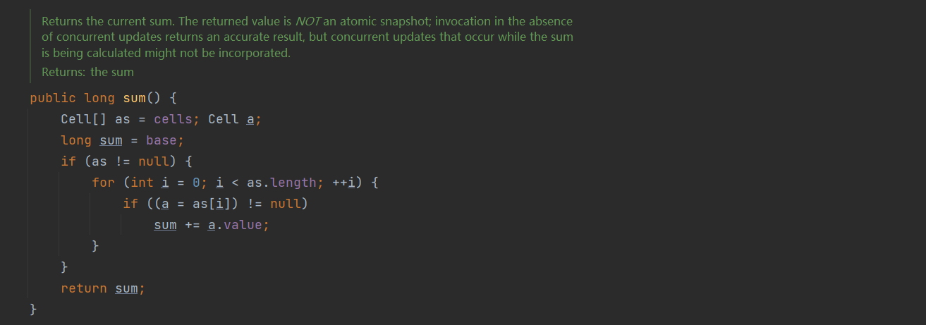 遍历 cells 数组和累加 base 的过程中,没有对 cells 数组或 Cell 实例加锁,其他线程可能正在修改某个 Cell 的 value,或对 cells 数组进行扩容,导致当前线程无法读取到最新的实时值;累加 Cell 值和 base 值是分步执行的,并非原子操作,两者之间可能存在其他线程的累加操作,导致结果不完整;