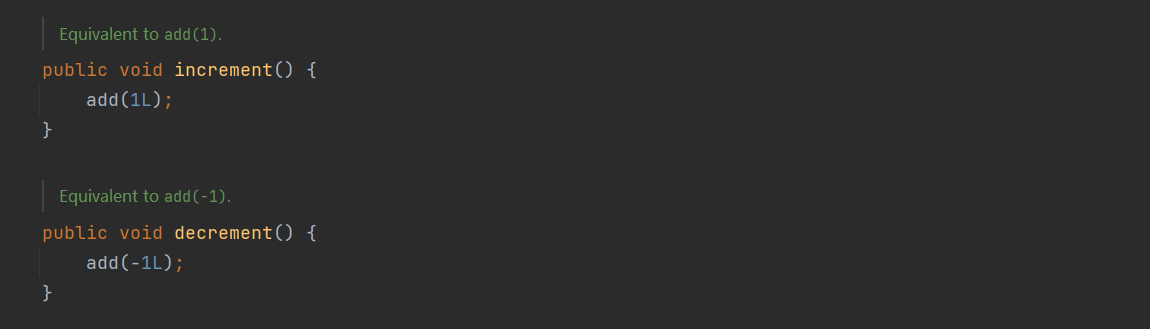 LongAdder 为了方便用户实现自增 1 和自减 1 这两个高频操作,提供了 increment() 和 decrement() 两个便捷方法,这两个方法的底层实现完全依赖于 add(long x)。