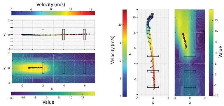 图3| 价值函数与飞行轨迹可视化。图中颜色代表Critic网络评估的价值(黄色为高价值区)。可以看到,AC-MPC学到的价值函数就像一个势能场,引导无人机穿越赛道门。当无人机穿过一个门后,高价值区域会迅速切换指向下一个门,体现了Critic通过学习Cost Function实现了类似离散模式切换的高级决策能力。