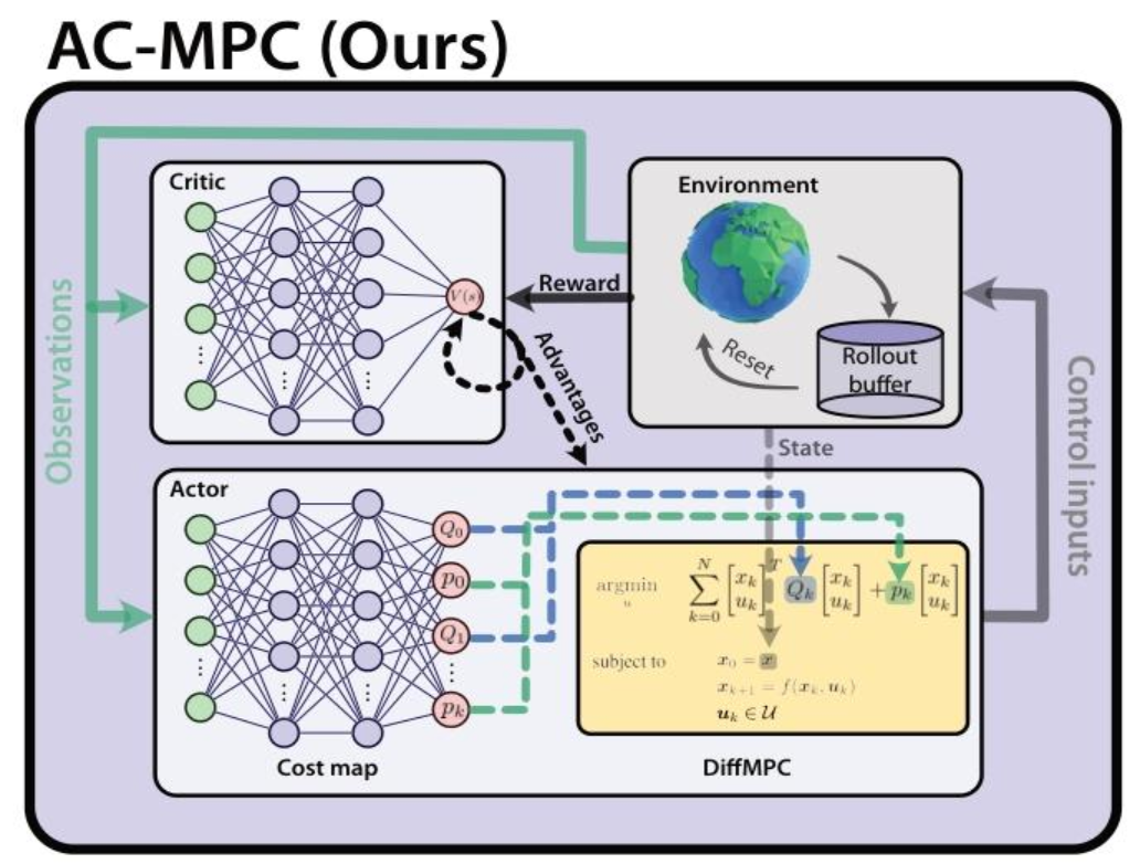 UZH RPG组的 AC-MPC 工作提出了一种将可微MPC无缝嵌入到Actor-Critic 强化学习框架的全新范式。该方法打破了传统学习动作的桎梏,转而让策略网络学习 MPC 的内部代价函数,从而在保留 RL 强大探索与端到端优化能力的同时,充分利用了物理模型处理约束和动态规划的优势。