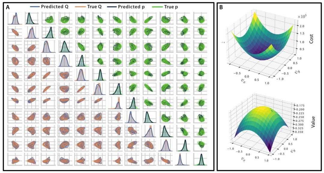 图8| 价值函数与 MPC 代价矩阵的关联性分析。(A) 预测的 Q 矩阵与真实的 Q 矩阵高度吻合,说明 Critic 深刻理解了控制任务的代价结构。(B) 3D 视图下,MPC 的代价函数曲面(上)与 Critic 的价值函数曲面(下)形状惊人一致,验证了两者在数学本质上的统一性。