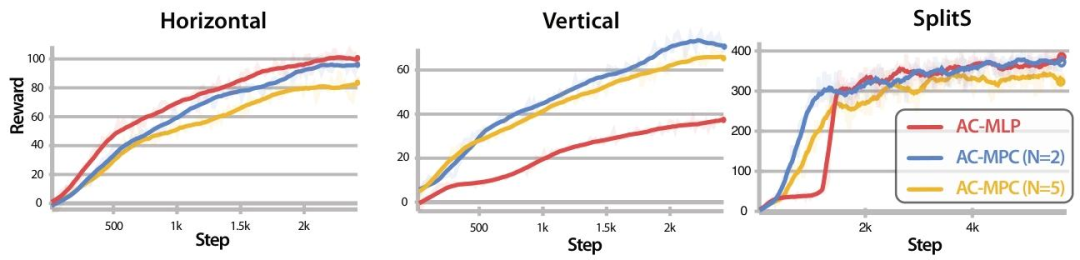 图5| 不同赛道下的训练曲线对比。在简单的水平赛道(左)上两者表现相当;但在高难度的垂直赛道(中)和 SplitS 赛道(右)中,AC-MPC(蓝/黄线)凭借动力学先验,展现出了比 AC-MLP(红线)更高的采样效率和最终性能上限。