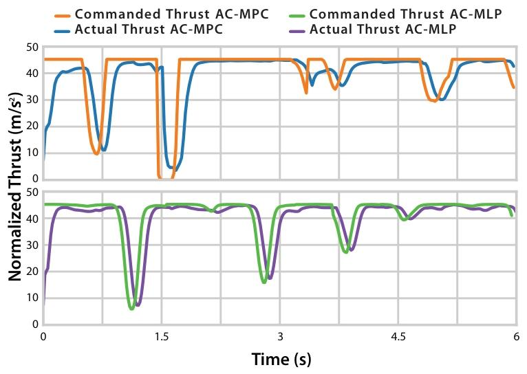 图4| 推力指令饱和度对比。AC-MPC(橙线)能够持续且稳定地将推力打到最大值(饱和),充分利用无人机的物理性能;而 AC-MLP(绿线)的推力输出则显得犹豫和波动,难以维持极限飞行。