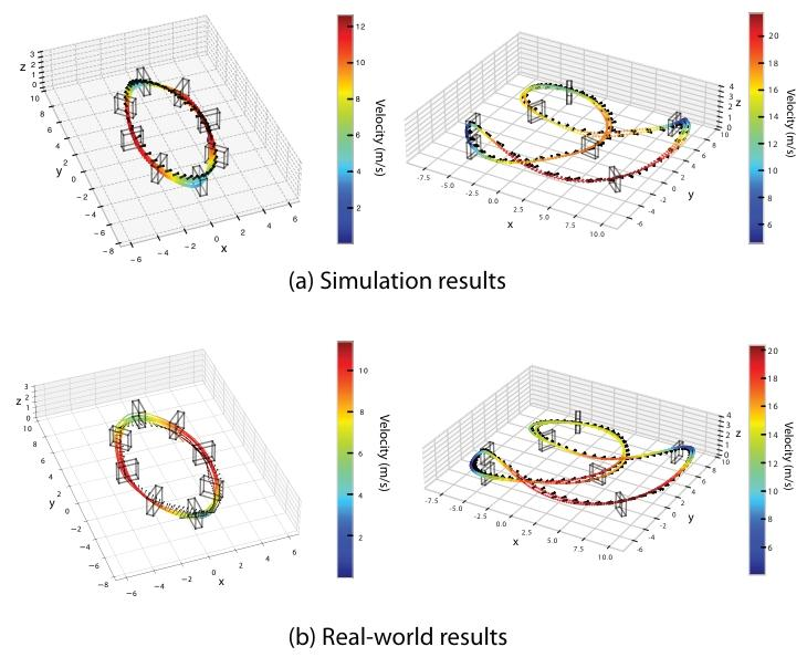 图9| 真实世界飞行轨迹。AC-MPC 在圆形赛道(左)和 SplitS 赛道(右)的真实飞行数据(实线)与仿真数据(虚线)高度重合。AC-MPC在真实环境中跑出了 21m/s 的峰值速度,实现了从仿真到现实的完美复刻。