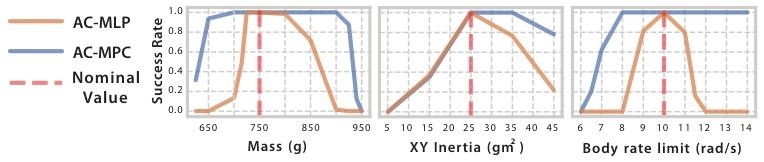 图7| 动力学参数泛化测试。在未重新训练的情况下,测试不同质量(Mass)和转动惯量(Inertia)下的飞行成功率。红线为训练时的标称值。可以看到,AC-MPC(橙线)在参数大幅偏离标称值时仍能保持近 100% 的成功率,而 AC-MLP(蓝线)则迅速崩溃。