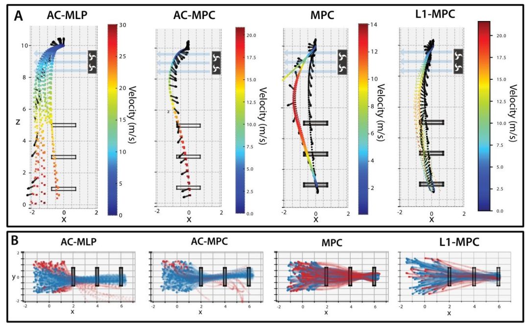 图6| 抗干扰能力可视化。(A) 在垂直飞行中施加 1.5 倍重力的侧向风扰。纯 RL 方法(AC-MLP)和传统 MPC 均告坠毁,只有自适应 L1-MPC 和本文的 AC-MPC 成功穿越,且 AC-MPC 速度更快。(B) 面对初始位置的随机变化,AC-MPC(中)的轨迹一致性显著优于 AC-MLP(左)。