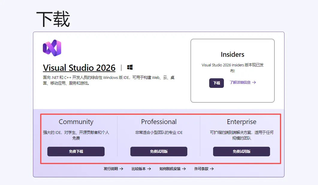 Visual Studio 2026 分别提供了社区版(免费)、专业版(付费)、企业版(付费),大家可以按需选择下载。