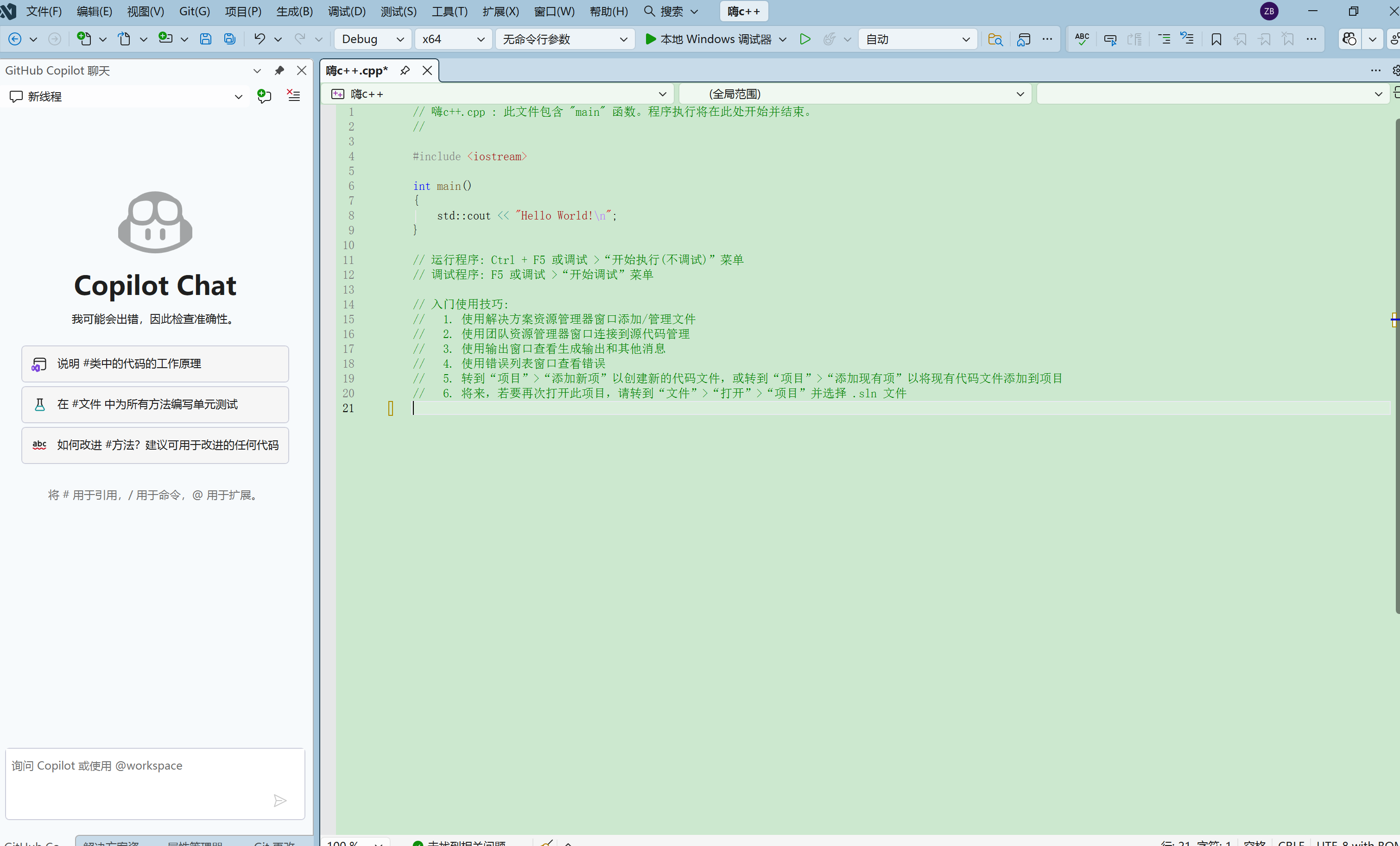 现在,屏幕上的内容就代表输出一个Hello World ,可点击上方本地windows调试器查看输出结果。