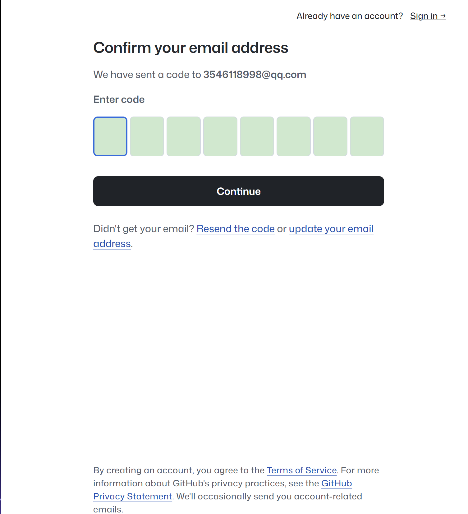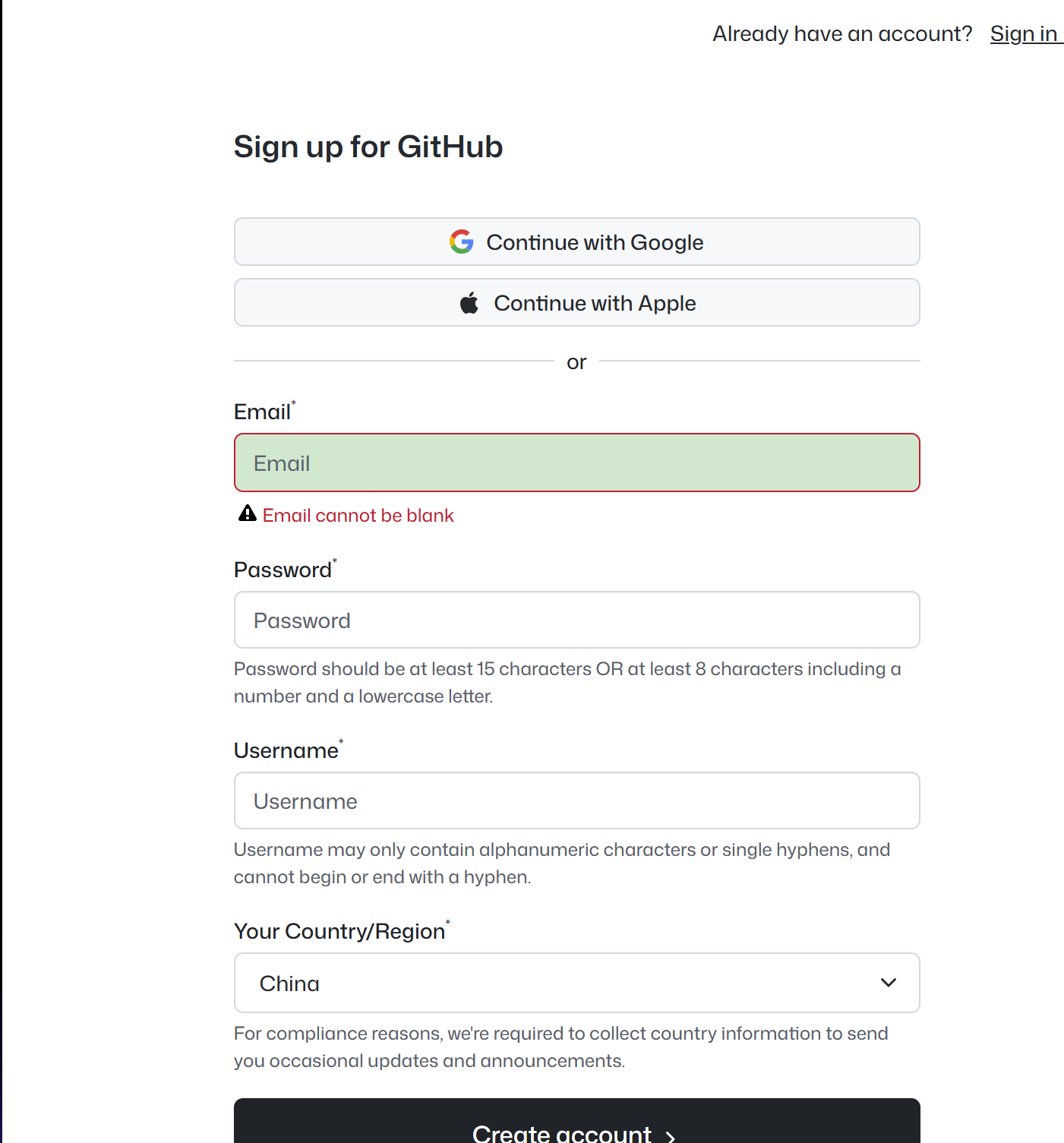 点击下方Create an account 进行注册(进不去网页可尝试多刷新几次,或使用加速器加速Git Hub,在此不再介绍)