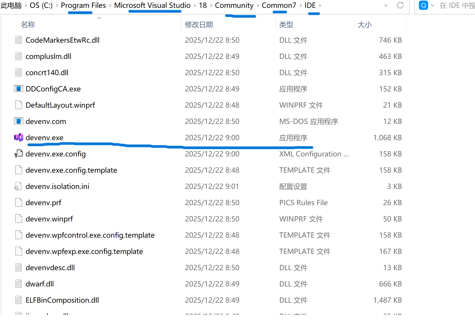 或我的电脑 (文件资源管理器),之前安装的文件所在盘符 (若为选择更改则默认为C盘),找到文件Microsoft Visual Studio (C盘中点击program files),进入community>Common7>IDE 中找到devenv.exe ,并双击运行此程序