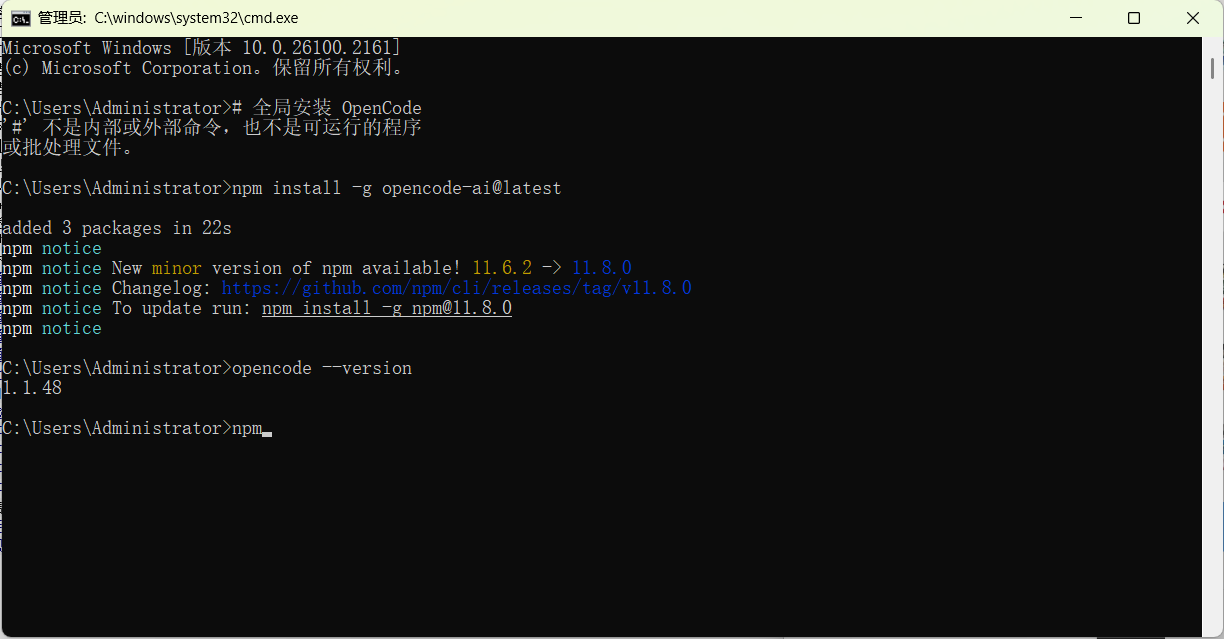 这个命令会从 npm 官方仓库下载并安装最新版本的 OpenCode。