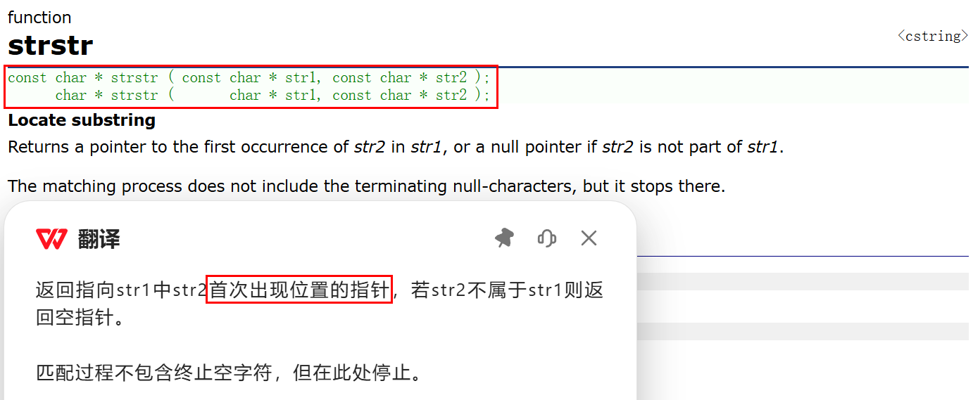 它可以直接获取到查找子串首次出现位置的指针,非常方便。