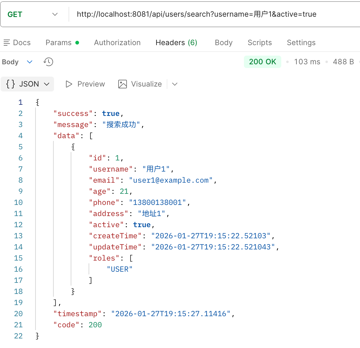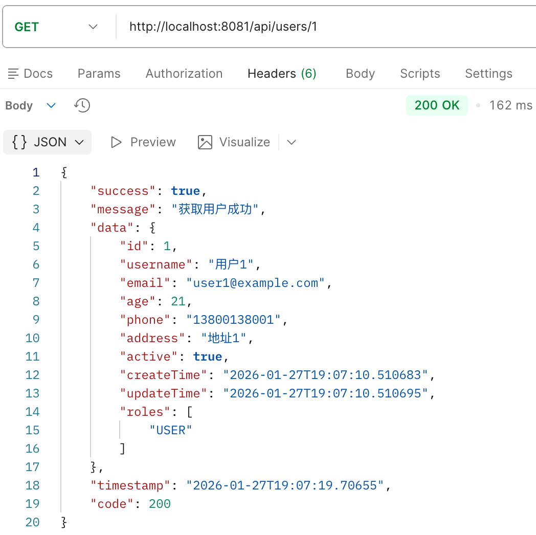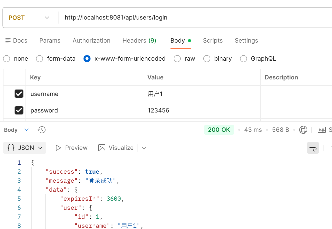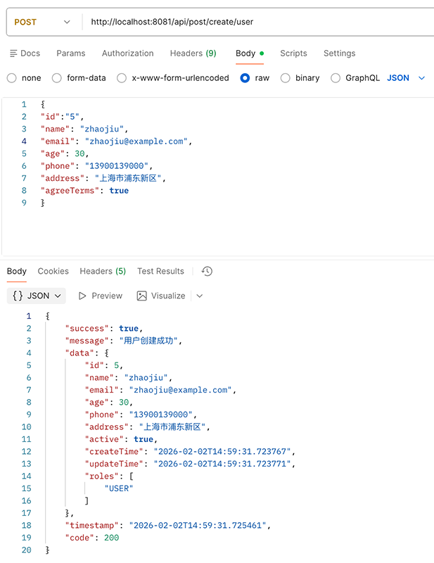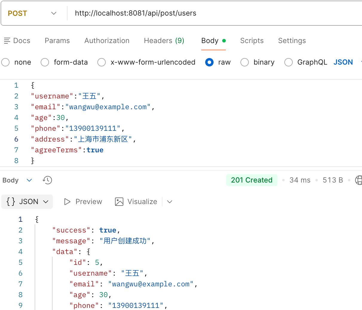 使用 Postman 测试: 通过Postman发送POST请求到创建用户接口,可以验证接口功能是否正常。