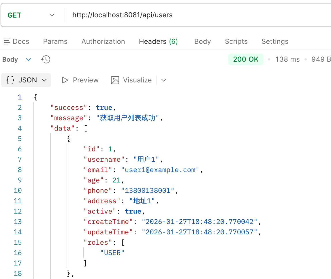接下来实现获取所有用户信息的接口。当用户数量较多时,直接返回所有用户可能导致性能问题,但在开发阶段,这个功能对于测试和数据验证非常有用。