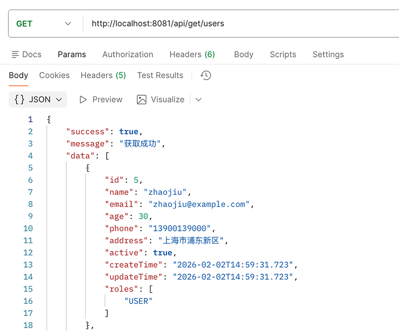 使用 Postman 测试: 通过Postman测试获取所有用户接口,可以查看当前数据库中的所有用户信息。