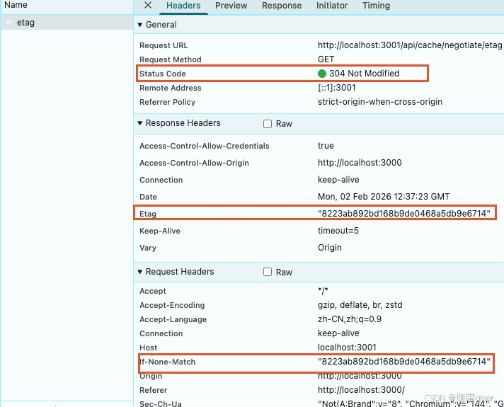 ✅ 协商缓存命中:返回 304 Not Modified,无响应体→浏览器使用本地缓存;