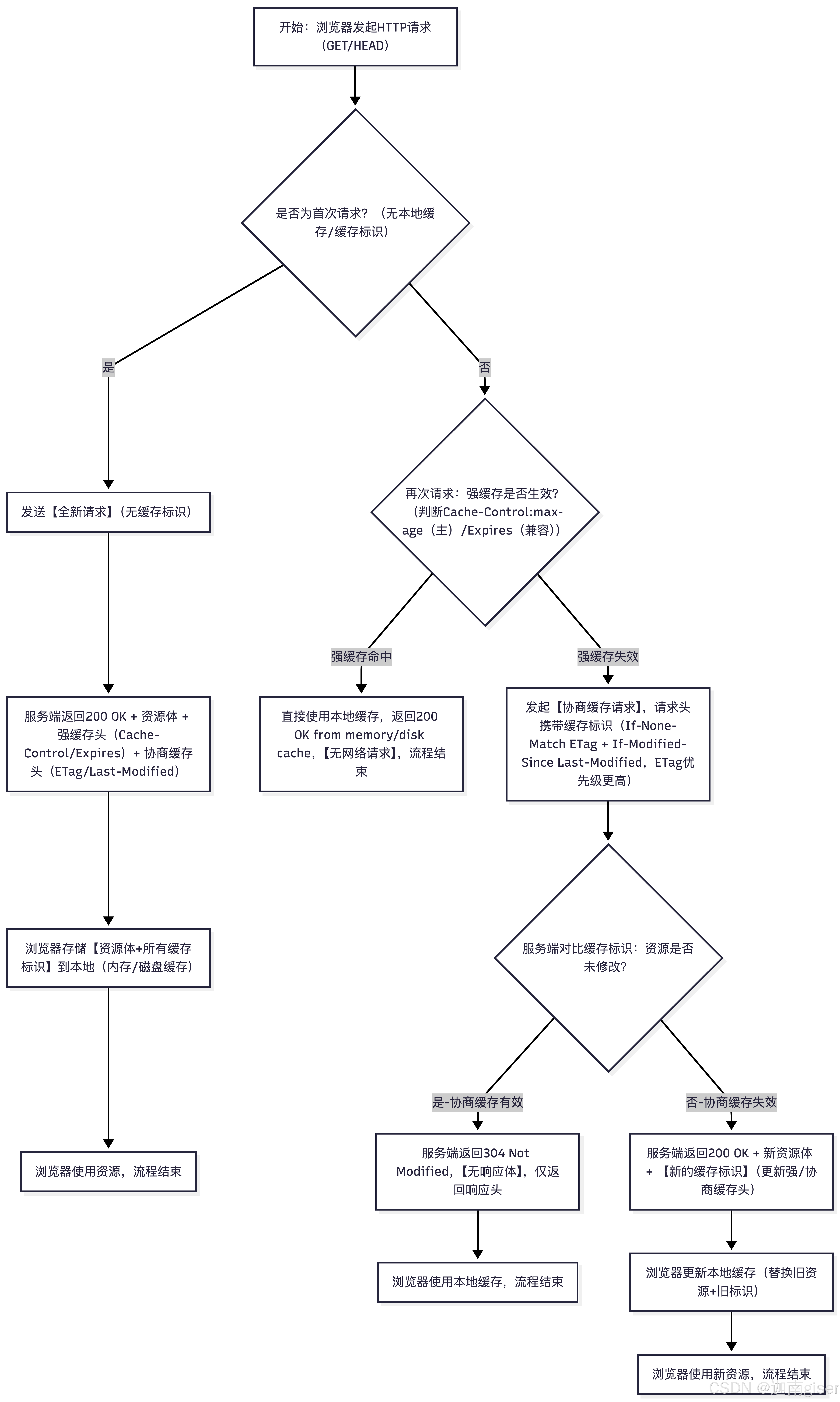 - 发送 GET 请求→服务端返回 200 OK,携带资源体 + 强缓存头 + 协商缓存头→浏览器存储资源体和缓存标识(响应头)到本地缓存(内存 / 磁盘);