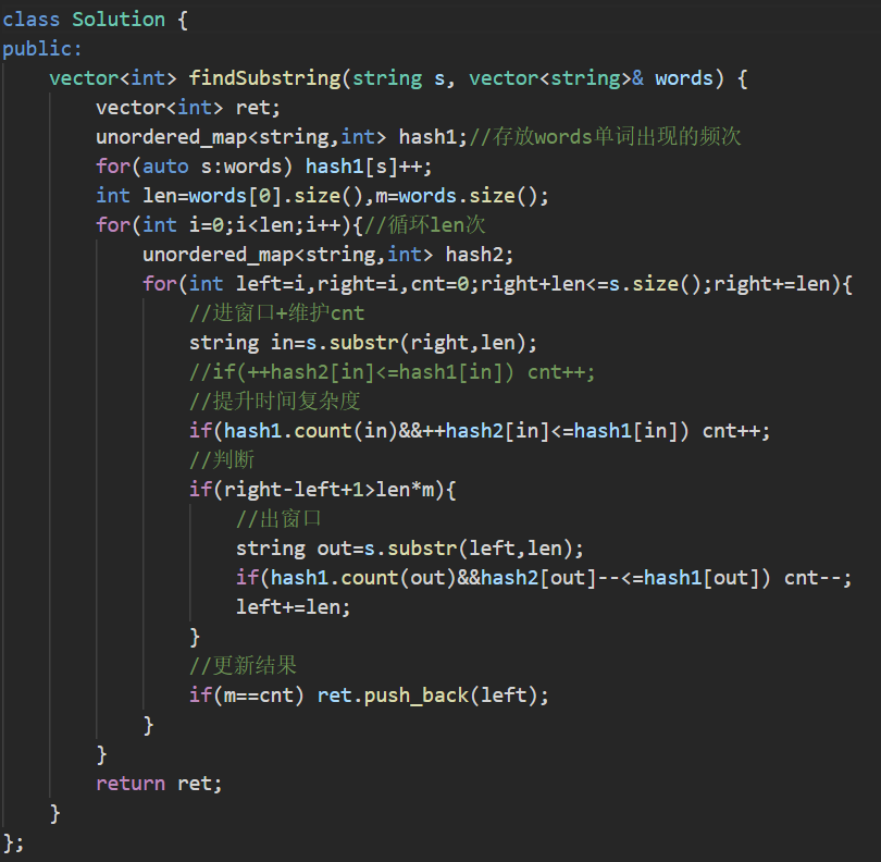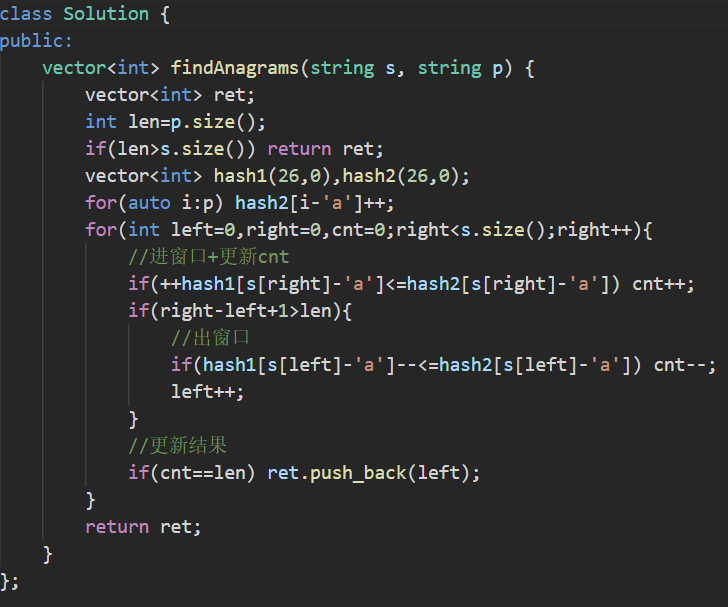 ●当窗口中每种字母的数量与字符串p中每种字母的数量相同时,则说明当前窗口为字符串p的异位词;