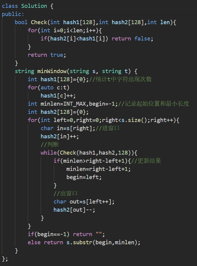 当动态哈希表中包含目标串中所有的字符,并且对应的个数都不小于目标串的哈希表中各个字符的个数,那么当前的窗口就是一种可行的方案。