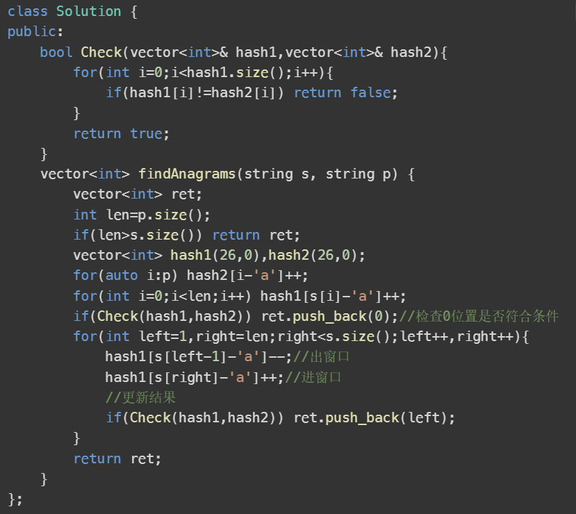 ●因此可以用两个大小为26的数组来模拟哈希表,一个来保存s中子串每个字符出现的个数,另一个来保存p中每一个字符出现的个数。这样就可以判断两字符串是否是异位词。
