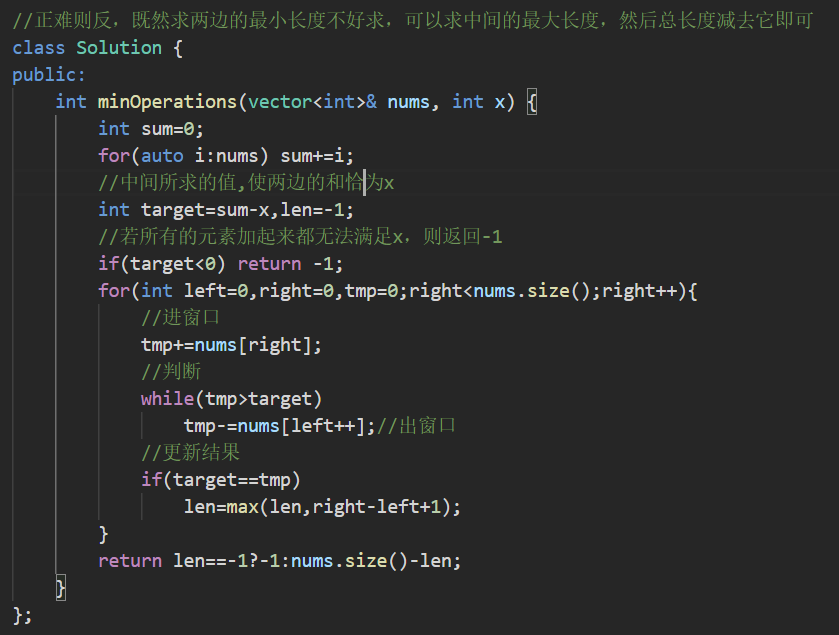 题目要求的是【左端+右端】两段连续的、和为x的最短数组,信息量稍微多一些,不易理清思路;我们可以转化成求数组内一段连续的、和为sum(nums)-x的最长数组。此时,就是熟悉的【滑动窗口】问题了。