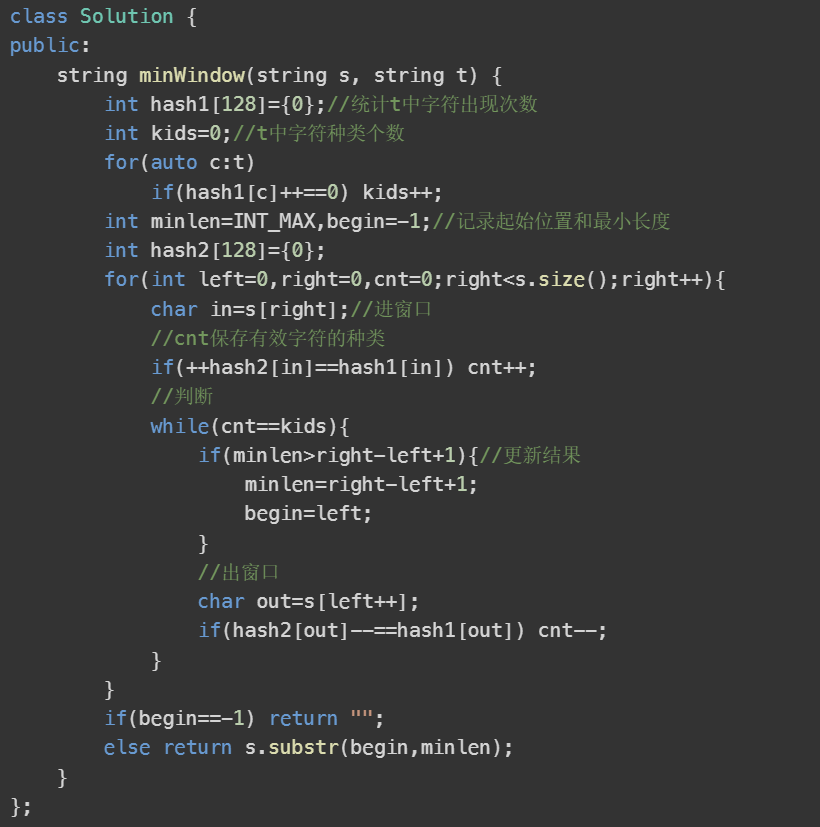 ●判断当前窗口是否变小。若变小:更新长度minlen,以及字符串的起始位置begin;