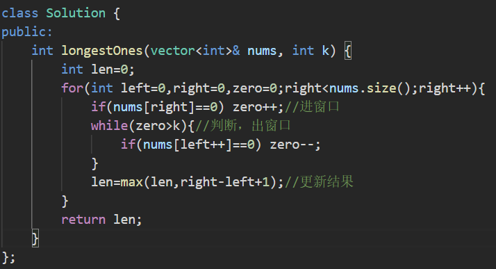 因此,我们可以把问题转化成:求数组中一段最长的连续区间,要求这段区间内的0的个数不超过k个。既然是连续空间,可以考虑使用【滑动窗口】来解决问题。