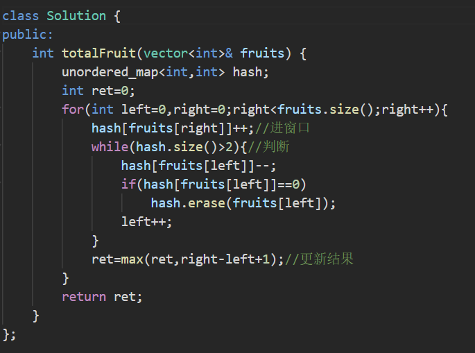 ●若没有超过2,说明当前窗口内水果的种类步超过两种,直接更新结果ret
