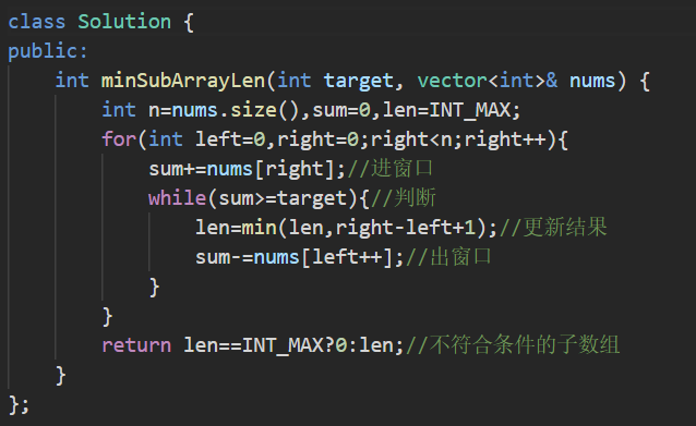 ●若窗口内元素之和大于等于target:更新结果,并将左端元素滑出的同时继续判断是否满足条件并更新结果(因为左端元素可能很小,滑出去之后依旧满足条件)