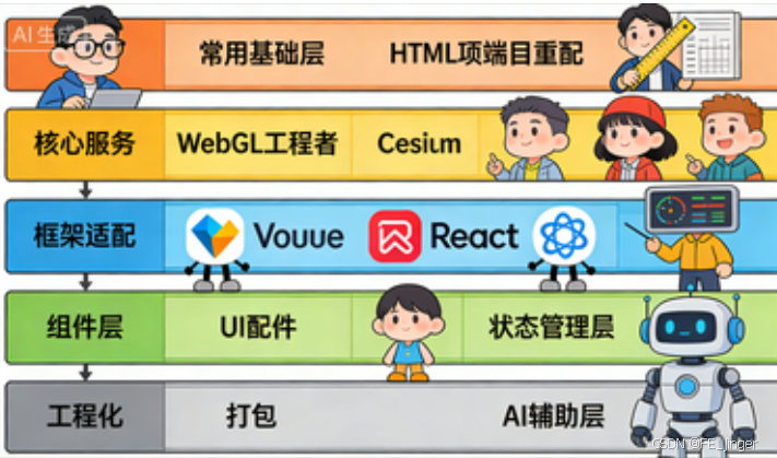 在之前的重构方案基础上,我们重点补充多端适配与兼容 核心内容,覆盖PC(桌面/平板)与移动端(手机/平板)全场景,解决布局适配、WebGL兼容、Cesium移动端性能、音视频跨端策略、交互差异等关键问题,同时更新架构设计、AI辅助体系、面试话术,形成「双框架+全端兼容」的完整重构方案,所有内容与原方案无缝衔接,可直接落地。