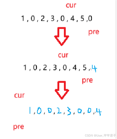- 定义两个指针:cur遍历原数组,pre模拟复写后的数组指针;