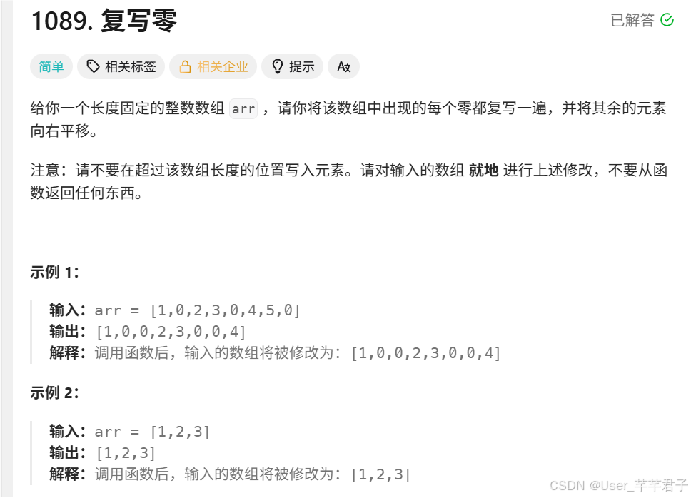 本解法通过双指针先定位复写边界,再逆向填充数组,既避免了正向遍历的元素覆盖问题,又实现了 O(n) 线性时间复杂度与 O(1) 常数空间复杂度的最优表现。其中"先确定边界、再逆向操作"的思路,是解决数组原地修改类问题的关键技巧,具有较强的通用性与实用性。