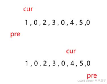 - cur==0时,pre向后移动两位,cur!=0时,pre向后移动两位(因为要复写0);